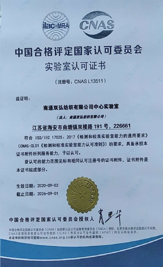 Nemrégiben a Nantong Double Great Textile Co., Ltd. központi laboratóriuma sikeresen megszerezte az akkreditációt a Kínai Akkreditációs Szolgálattól a megfelelőségértékelés céljából (CNA -k) és bizonyítványt kapott. Ez egy újabb értékes képesítés, amelyet a laboratórium szerzett, miután a China Cotton Textile Association fonalképzőplatformjává vált. A Double Great Company központi laboratóriuma az országban a kiemelkedő pamut -forgó vállalkozások egyik fejlett laboratóriumává vált.