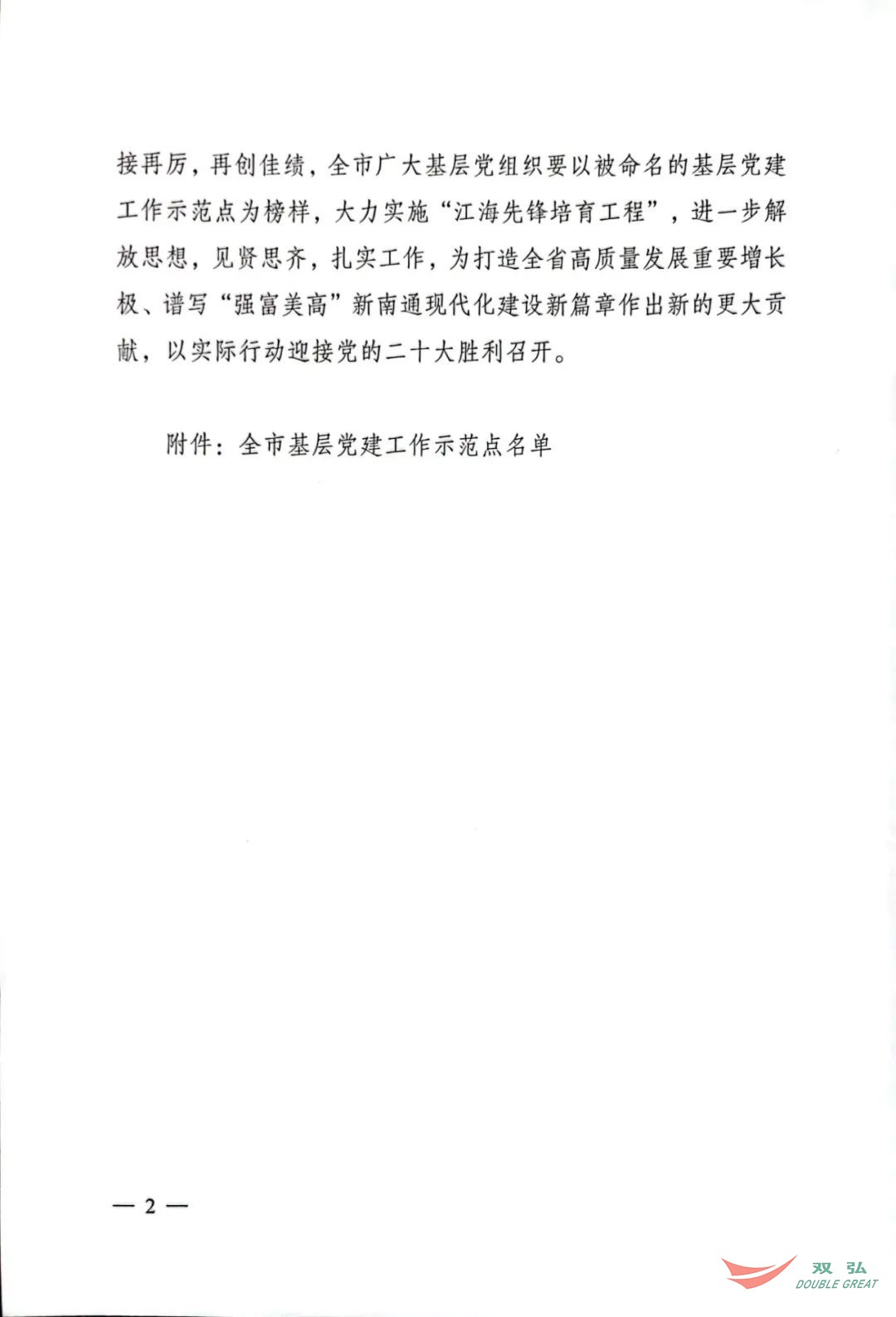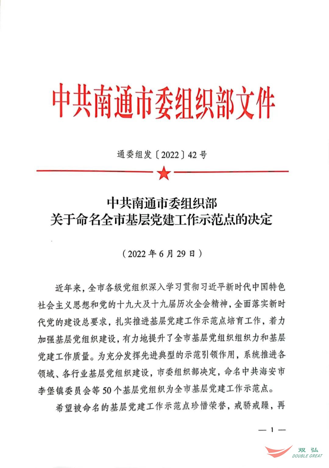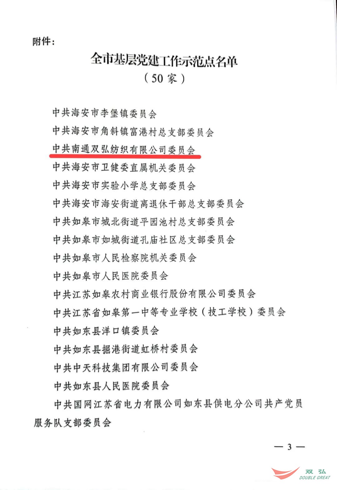 A közelmúltban a CPC Nantong Városi Bizottság szervezeti osztálya kiadott egy dokumentumot, amely 50 alulról szervezőt nevez, mint a város alulról alulról épülő demonstrációs helyszíneket. A Nantong Double Great Textile Co., Ltd. pártbizottsága elnyerte a "The City's Grassroots Párt épület demonstrációs helyének" címét.